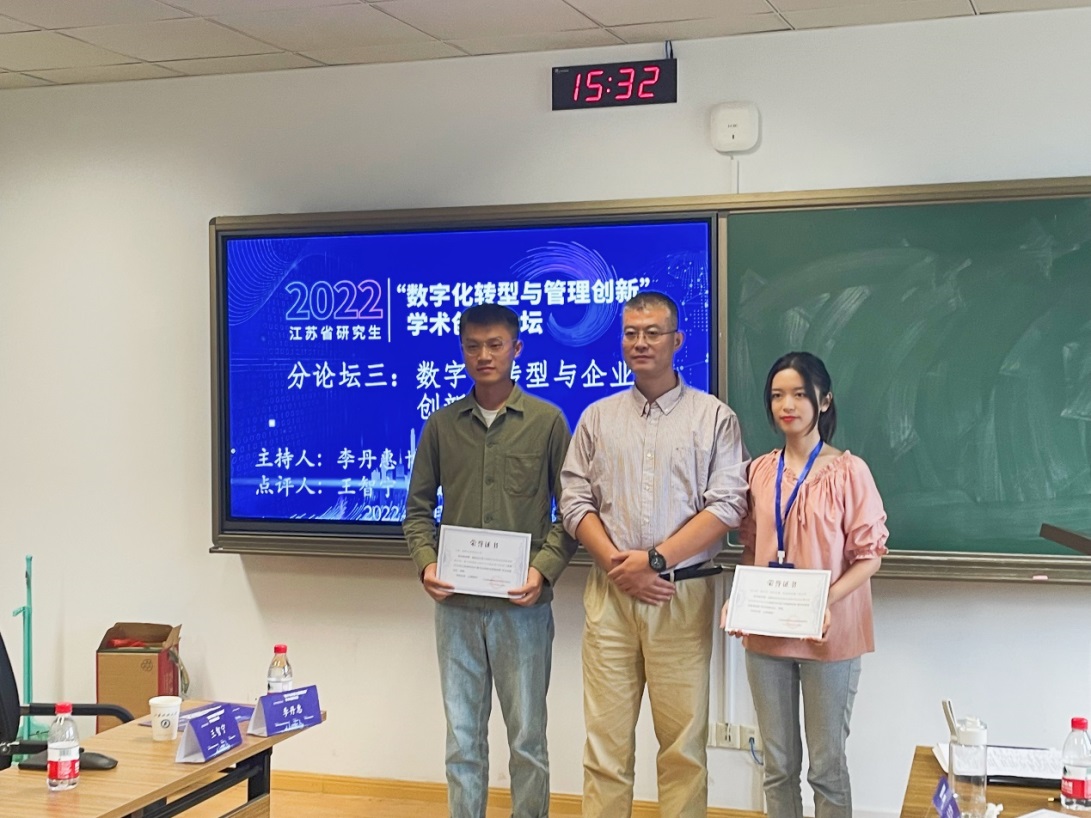 两位参会研究生在分论坛三分别就“企业数字化转型前因组态”、“新冠肺炎疫情前后企业数字化转型研究对比” 进行了论文汇报,与在场各位专家学者进行了深入交流,并荣获优秀论文二等奖。