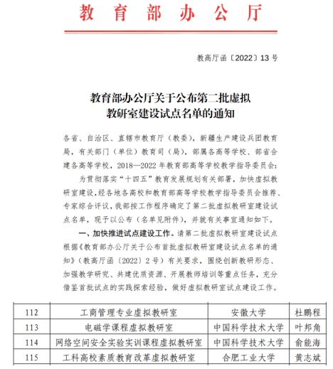 近日,教育部办公厅发布《关于公布第二批虚拟教研室建设试点名单的通知》(教高厅函〔2022〕13 号),由安徽大学牵头,包括我校在内的长三角地区七所高校参与申报的“工商管理专业虚拟教研室”成功入选教育部第二批虚拟教研室建设试点名单。