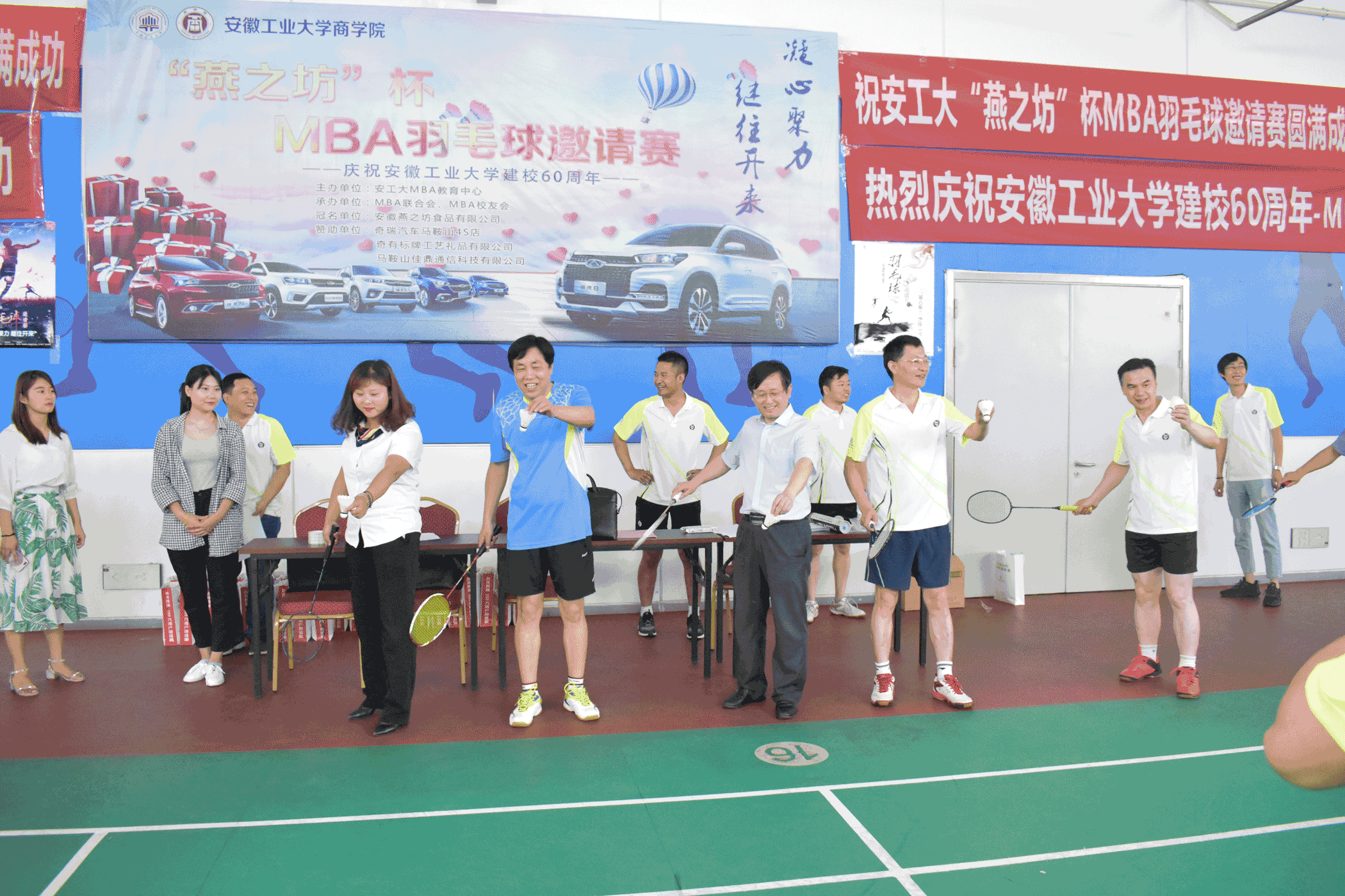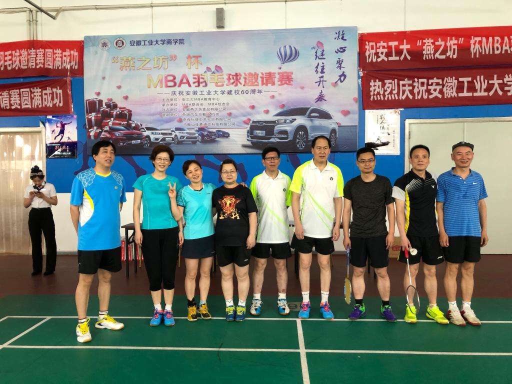 为迎接安徽工业大学60周年校庆,传承文化底蕴,弘扬优良传统,展示办学成就,扩大社会影响,MBA教育中心以羽毛球邀请赛为载体,凝聚校友力量,丰富师生业余生活,促进MBA学员和学员单位之间广泛交流,现由MBA教育中心主办,MBA校友会&MBA联合会共同承办“凝心聚力继往开来”“燕之坊”杯MBA羽毛球邀请赛,比赛于2018年6月24日在奥体爱玛会羽毛球馆(安工大东校区)举行,应邀参加本次比赛的十支队伍分别是安徽MBA代表队,安工大教工代表队,足球数据网