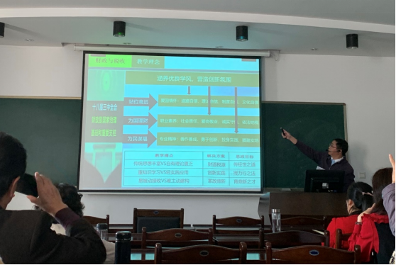 陈昌龙从教学理念、教学内容、教学过程、教学评价四个方面对《财政与税收》课程进行了展示。以“财思方圆守正,税政古今鼎新”的案例,阐述“站位高远、为国理财、为民谋福”教学理念,充分挖掘二十大报告中有关财政与税收的论述,坚持问题导向,将爱国情怀、职业素养、专业精神等思政元素自然融入课程内容,入盐入水。