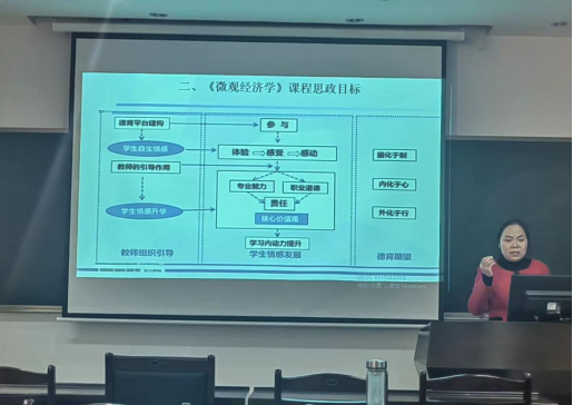 程佳韫对留学生课程《国际经济学》进行了教学展示,以培养具有全球化思维的“知华、友华、亲华”的高素质留学生为课程目标,主要阐述如何把思政元素融入来华留学生教育中。查会琼和顾银宽也从多角度分别对《微观经济学》和《企业集团财务管理》课程进行了教学展示,查老师强调德育平台的构建和教师的引导作用,表达了“固化于制、内化于心、外化于行”的德育期望,给专业课程注入了灵魂。顾老师则从企业集团及其财务管理概述、企业集团财务战略、企业集团财务管理体制和企业集团财务组织制度四个方面分别融入发展史思政、国企治理、相关财经法规等元素,寓教于乐,潜移默化的增强学生的意识形态。