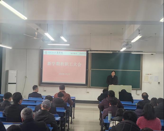 召开新学期教职工大会。周世军对本科生毕业论文指导、期末考试、教学材料归档、新商科云实验中心建设等工作做了相关要求;吴金南就科研项目申报、学术交流、安徽省社科奖申报工作进行了交流;李伟军对研究生复试、硕士生导师遴选、同等学历研究招生等工作做了相关安排;张虎就班主任与导师工作、教风学风、学科竞赛指导、毕业生工作、校友联系等方面工作进行了交流。