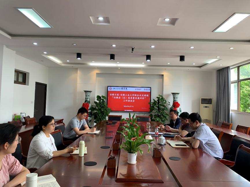 召开了安徽日报—安徽工业大学联合攻关课题“安徽县(区)高质量发展评价”研究工作推进会。院党委书记杜飞、院长章铁生、副院长周世军、相关研究领域的中青年骨干教师参会,会议由周世军主持。