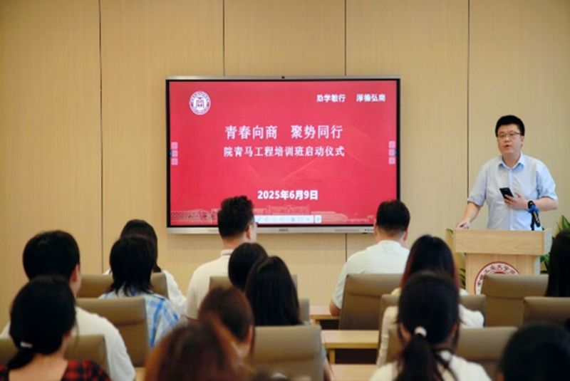 于秀山校区汇文楼B204教室举办2025年度“青马工程”培训班开班仪式,院党委书记杜飞,院党委副书记、纪委书记、副院长蒋磊,院团委副书记刘在春、王天蓝、张舒及全体青马学员参会,开班仪式由刘在春主持。