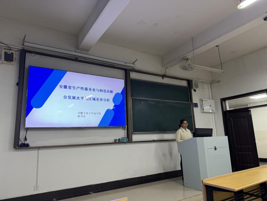 崔书会博士以“安徽省生产性服务业与制造业融合发展水平与区域差异分析”为题作了成果汇报,她通过构建多维度指标体系,测度了安徽省生产性服务业与制造业融合发展水平,并对比了皖南、皖中和皖北不同地域城市两业融合中存在的空间差异及其内在根源。