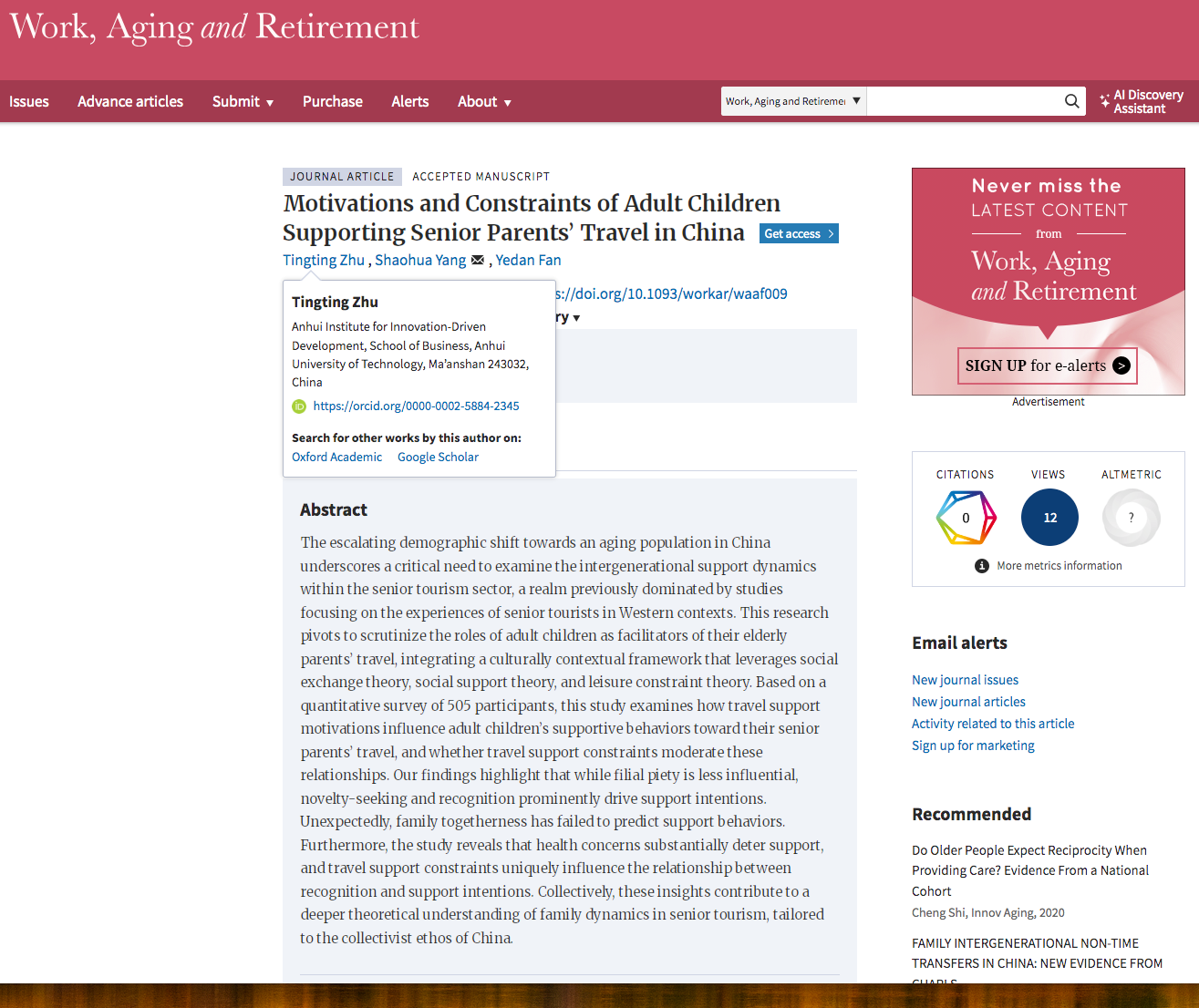 朱婷婷副教授在国际高水平学术期刊《Work, Aging and Retirement》(工作老龄化和退休)发表题为《Motivations and Constraints of Adult Children Supporting Senior Parents’ Travel in China》的研究成果。朱婷婷为第一作者,通讯作者为足球数据分析