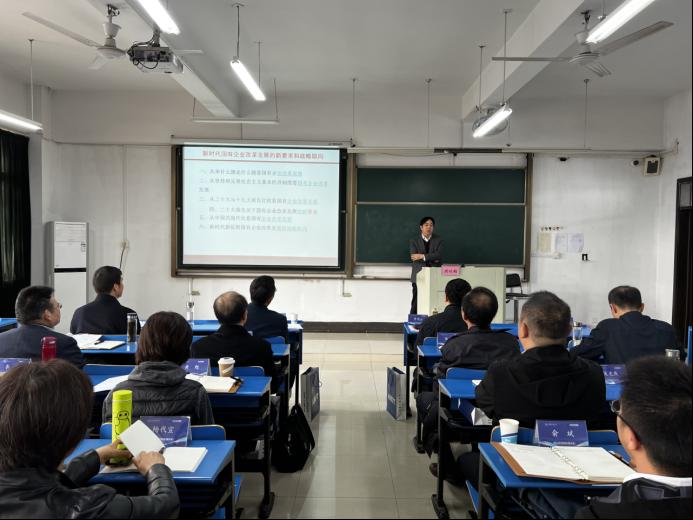 洪功翔指出,国有企业是推进国家现代化、保障人民共同利益的重要力量,是党和国家事业发展的重要物质基础和政治基础。深化国资国企改革,做强做优做大国有资本与国有企业,是坚持和发展中国特色社会主义的必然要求,是实现“两个一百年”奋斗目标的重大任务,是推动我国国有经济高质量发展的客观要求。接下来,他从举什么旗走什么路看国有企业改革发展、从坚持和完善社会主义基本经济制度看国有企业改革发展、从党的二十大与十九大报告比较看国有企业改革发展、从党的二十大报告关于国有企业改革发展的新表述、从中国式现代化看国有企业改革发展五个方面深入阐释了国有企业的改革发展,他强调,新时代新征程国有企业改革发展的战略取向要巩固公有制的主体地位,不断促进共同富裕目标实现,完善中国特色的现代企业制度,把有企业家能力、有事业心和奉献精神的优秀人才选拔到经营者岗位上,要用伟大建党精神指导国有企业改革发展。