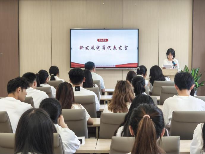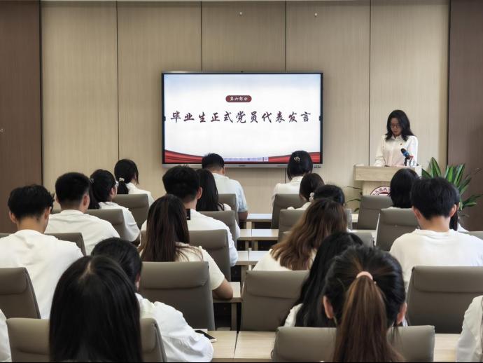 学生第一党支部江薇同志作为新发展党员代表发言。分享了成为一名预备党员的激动心情与深刻感悟,表达了以党员标准严格要求自己、在学习和实践中发挥先锋模范作用的郑重承诺。学生第九党支部石丹阳同志作为毕业生正式党员代表发言。她结合自身成长经历,勉励新党员们珍惜政治生命,接续奋斗,以实际行动为党旗增辉添彩。