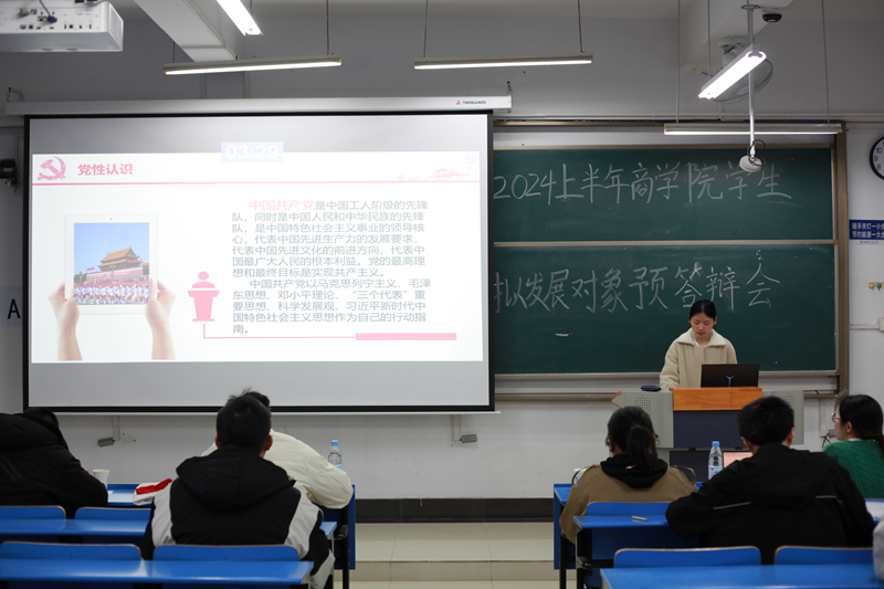 答辩会开始后,各积极分子依次上台进行自我介绍,深刻阐述个人入党动机,充分展现个人入党积极性,同时,每位同学都认真反思自身存在的不足,对自己作出深刻认识,明确未来发展的方向。个人汇报结束后,现场随机抽取题目进行作答,这不仅考察了学生的政治素质和理论水平,还考验了学生的综合素质和临场应变能力。答辩会结束后,老师们首先对各位同学的充分准备给予了高度肯定,同时指出大家还需要加强对党章党纪的学习,树立正确的入党动机,发挥好先锋模范作用,真正做到从思想上、行动上入党。
