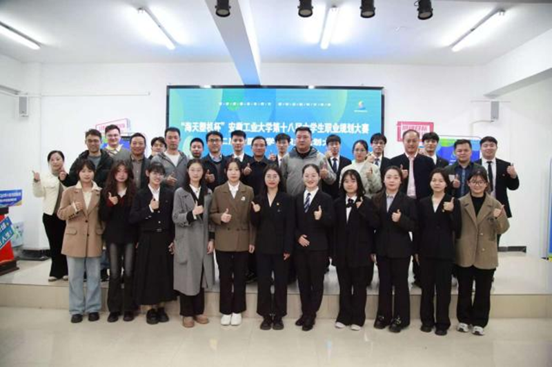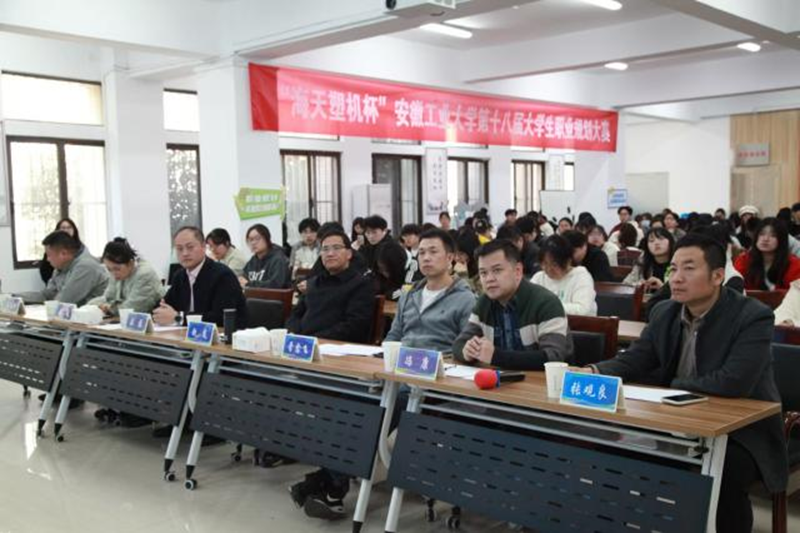 副院长、党总支副书记冯康,马鞍山师范高等专科学校就业指导中心主任晋愈飞,新安人才网马鞍山分公司总经理刘丹,马鞍山方圆精密机械有限公司的人力资源总监、安徽工业大学校友张观良,安徽创杰环境科技有限公司董事长、安徽工业大学校友王文祥莅临指导。同时,我们邀请海天塑机集团人力资源部张程斐部长进行线上评审。参赛选手以及感兴趣的同学共130余人参加了比赛。